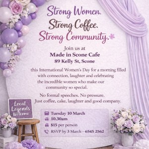 Strong Women. Strong Coffee. Strong Community. Join us at Made in Scone Cafe this International Women’s Day for a morning filled with connection, laughter and celebrating... 10 Mar 10:30 am