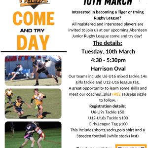 Aberdeen Junior League Come’n’Try Day Are you interested in trying Rugby League, and becoming an Aberdeen Tiger? Aberdeen Junior League are holding a Com and... 10 Mar 4:30 pm - 5:30 pm