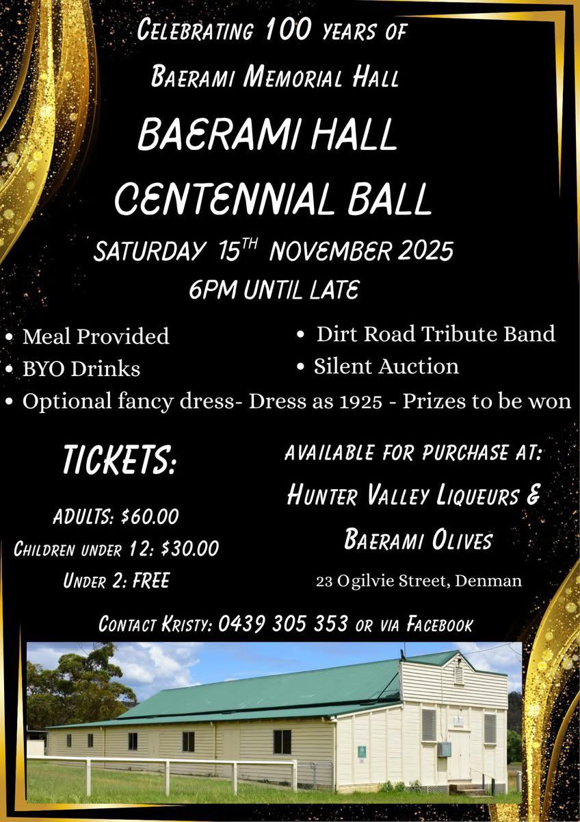 Celebrating 100 years of the Baerami Memorial Hall – Baerami Hall Centennial Ball Saturday 15th November 2025 6pm until Late