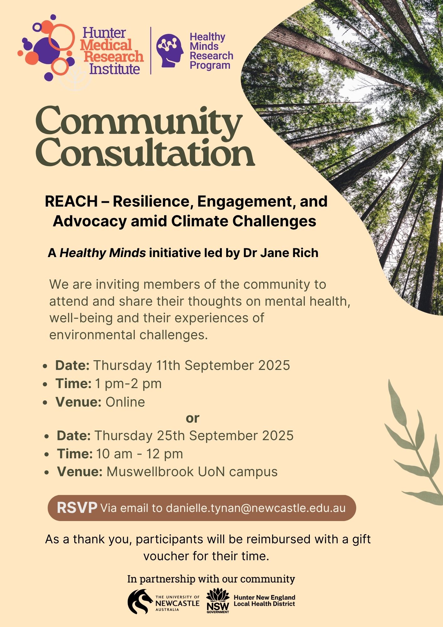 REACH is a project that aims to co-create, with the community, an evidence-based digital health resource to support the mental health of people impacted by environmental threats.