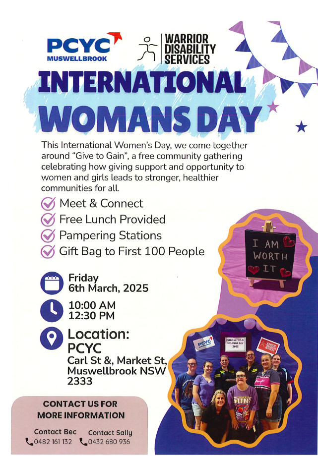 Friday 6th March from 10am – 12.30pm at the PCYC Muswellbrook, Carl St & Market St.