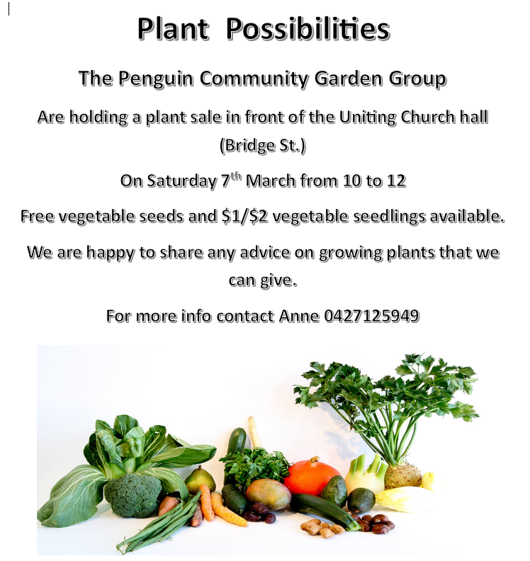 The Penguin Community Garden Group are hosting a plant sale. Free vegetable and flower seeds, and cheap vegetable seedlings available. Happy to share our knowledge of plants as well.