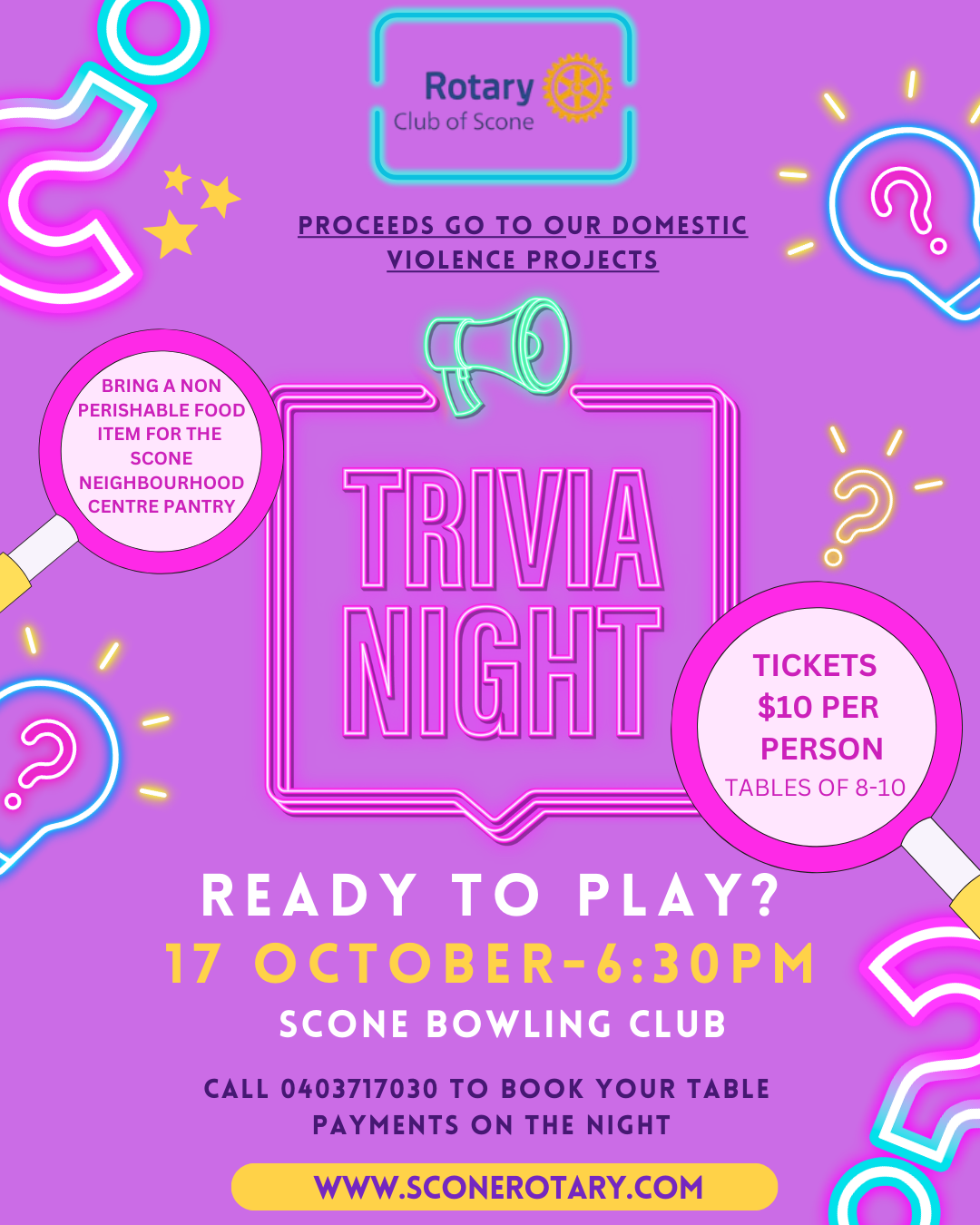 Grab your fellow knowledge-nerds and organise a table at the Rotary Club of Scone’s Trivia Night being held on Friday 17 October at the Scone Bowling Club.