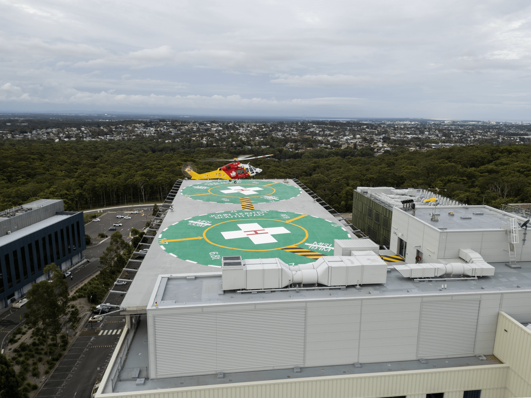 The helipad sits atop the hospital’s new seven‑storey acute services building, part of the $835 million John Hunter Health and Innovation Precinct redevelopment. It is expected to become operational when the new building opens to patients later this year.